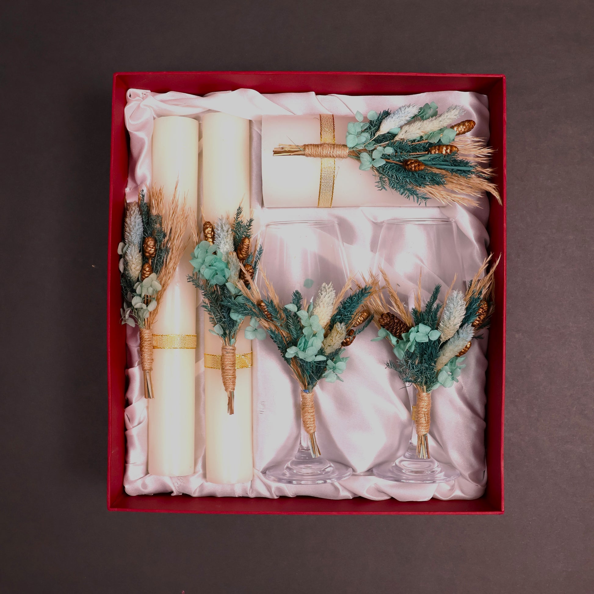 The Emerald Elegance Gift Set is a sophisticated collection featuring three taper candles, one pillar candle, and two glass holders, each beautifully adorned with deep green dried florals, golden accents, and natural textures. Presented in Satvika’s signature crimson gift box with satin lining, this set blends luxury with earthy charm. Perfect for festive décor, intimate gatherings, or as a premium gift, the Emerald Elegance Gift Set adds a touch of richness, serenity, and timeless beauty to every occasion.
