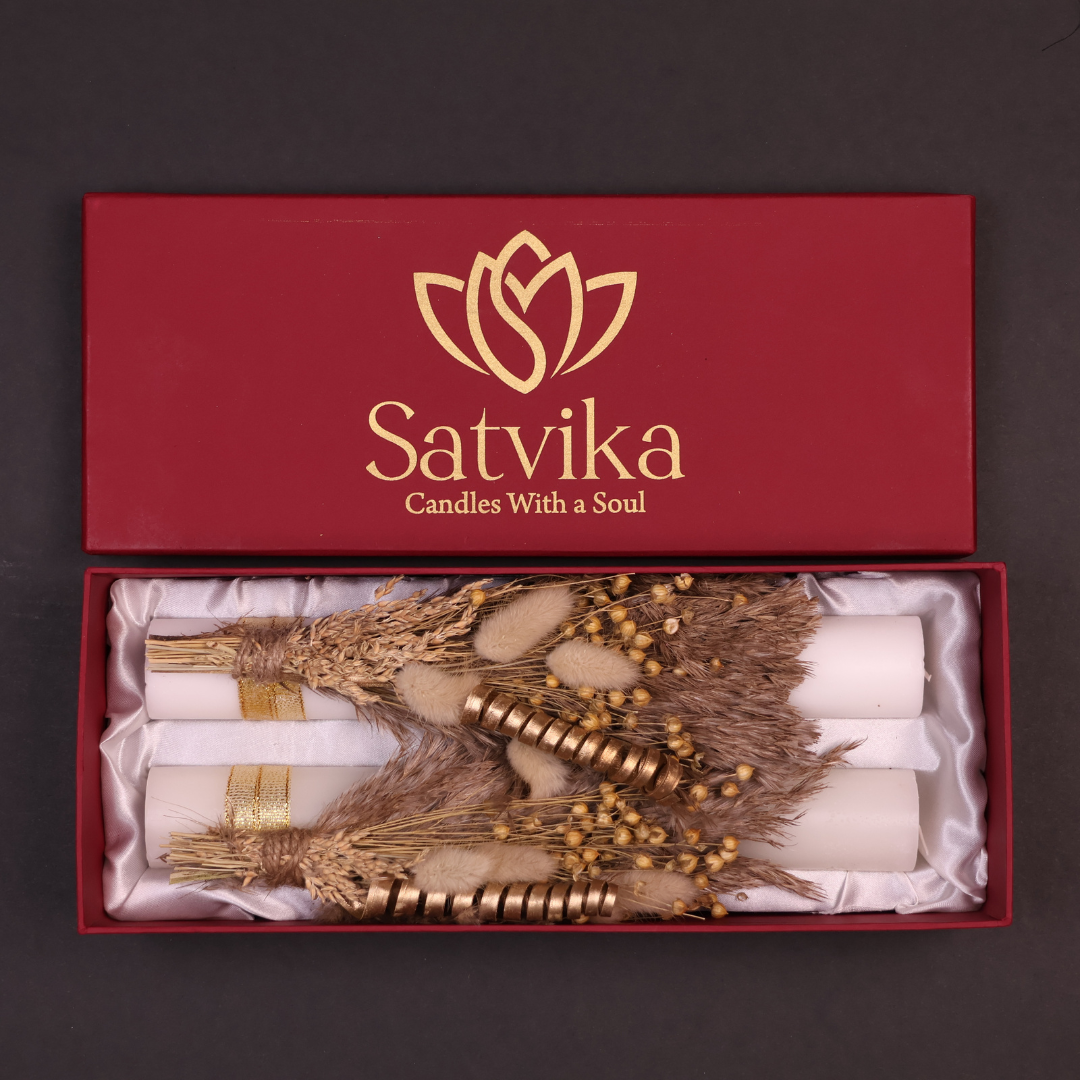 The Golden Harvest Taper Set brings together rustic charm and refined elegance. This set of white handcrafted taper candles is beautifully adorned with golden accents, dried florals, and natural textures, presented in a premium crimson gift box. Perfect for festive tablescapes, intimate dinners, or as a luxurious gift, the Golden Harvest Taper Set embodies warmth, tradition, and timeless sophistication. Its graceful glow creates an inviting ambiance for every cherished occasion.